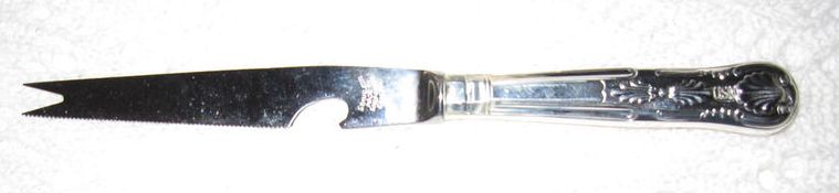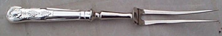 | Great White Fleet thru WWII. Carving Fork with Captains Eagle Clutching Arrows, 10" overall length, super sharp tines, flip out stopper or stay to help steady the meat being carved. Beautiful gun metal gray tines indicating the high nickel content used back in the day to produced hard stainless steel. |